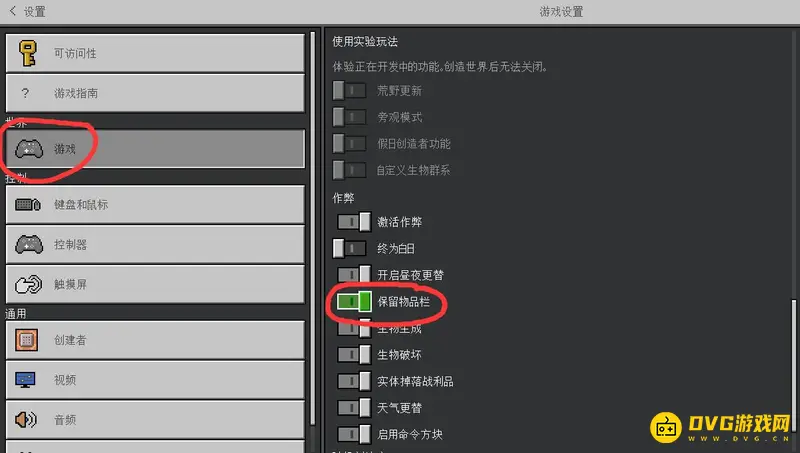 2,接着点击左侧的游戏,把右侧的保留物品栏给打开,就可以开启地狱末地死亡不掉落了。