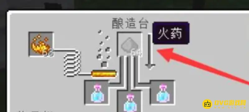 2.在上面放入火药即可制作喷溅型药水,同时在雪屋地下室的酿造台中可以找到一瓶喷溅虚弱药水,以及对着含有喷溅药水的炼药锅使用玻璃瓶,也可以得到一瓶喷溅药水。