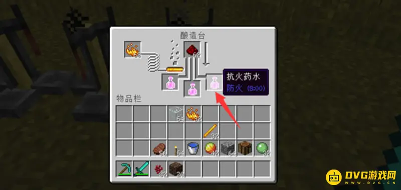 3.再在酿造台中使用粗制的药水和岩浆膏,就可以制作出抗火药水了。