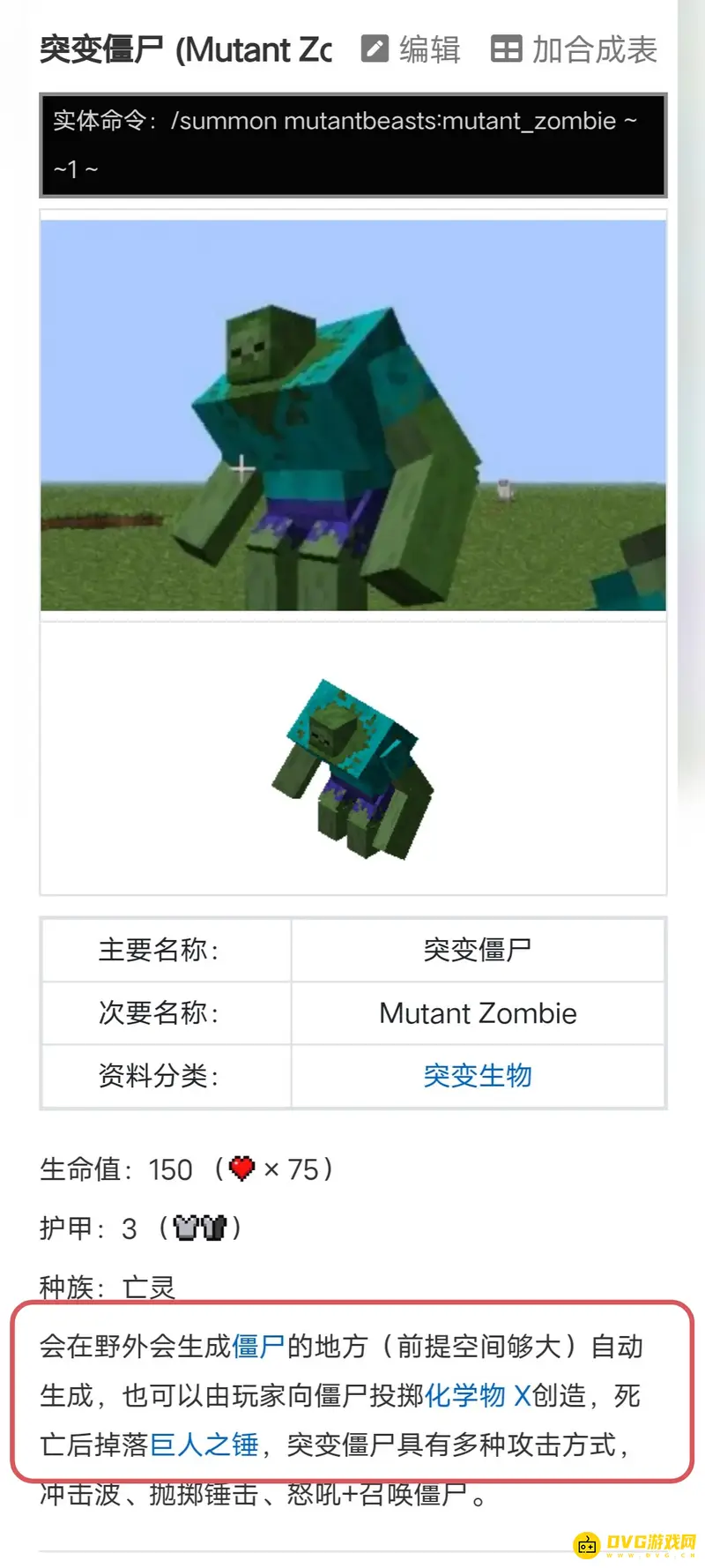 玩家向僵尸投掷化学物 X创造,死亡后掉落巨人之锤。突变生物模组当中僵尸可是大变样了,体型变得更加的魁梧和强壮,并且还拥有了多种强力的技能,比如冲击波,抛掷锤击,怒吼和召唤僵尸等。