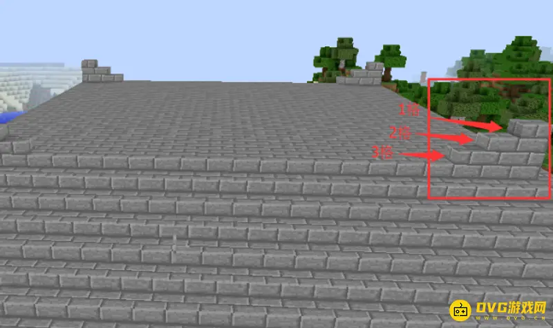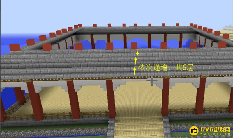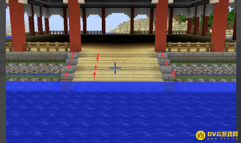 6、在中间区域的两个柱子向下用石砖半砖做成楼梯状,每个间距是半格。