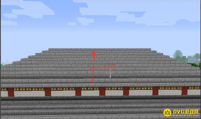 11、把12层进行封顶,并在屋顶放置“吻兽”,用半砖,依次3格、2格、1格,放置4个角,如图所示。