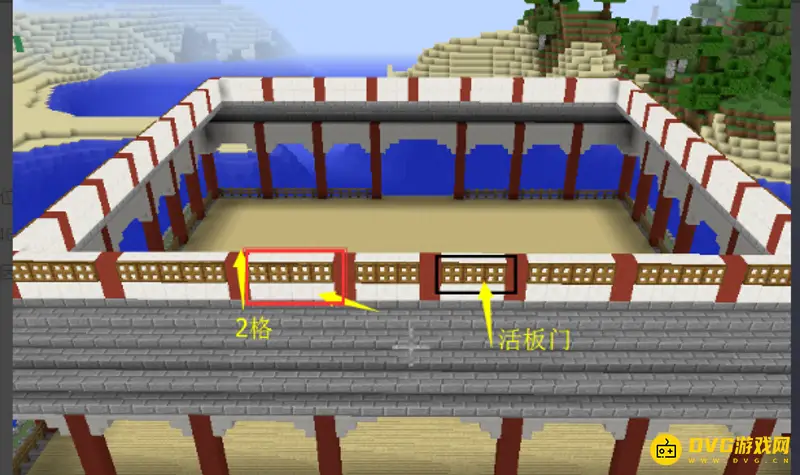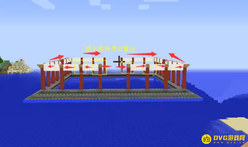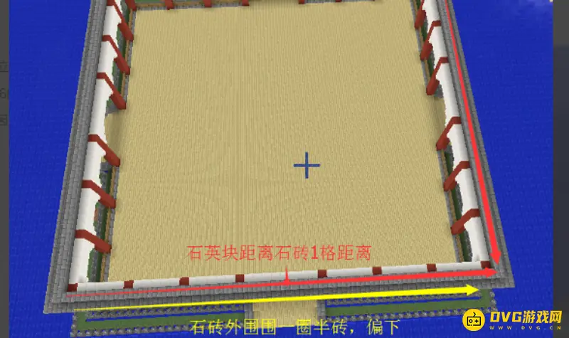 9、在每个柱子之间用2格高的石英块连接起来。包括中间区域。并在最高处的石英块上放置上活板门。注意红色染色泥土上不要放活板门。