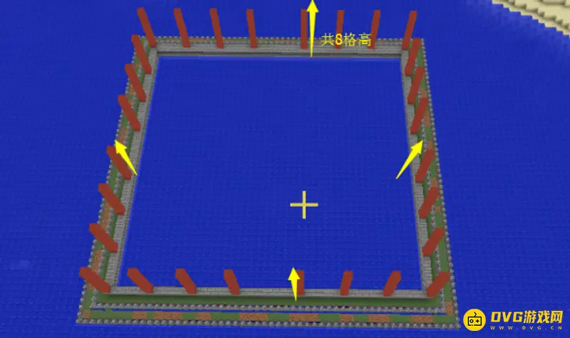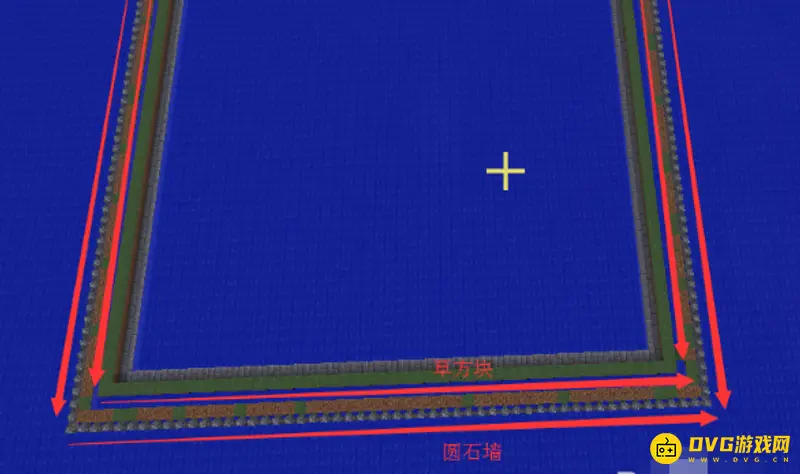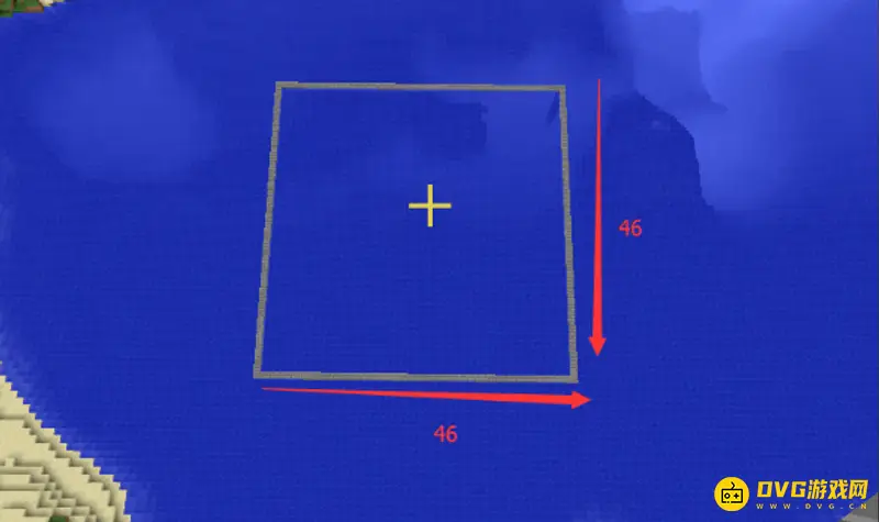 1、首先找一个合适的位置,用石砖(或任意方块)围起一圈46X46的地方。这里以在水上建造为例,因为在陆地上容易遇到怪而且地形不规则。