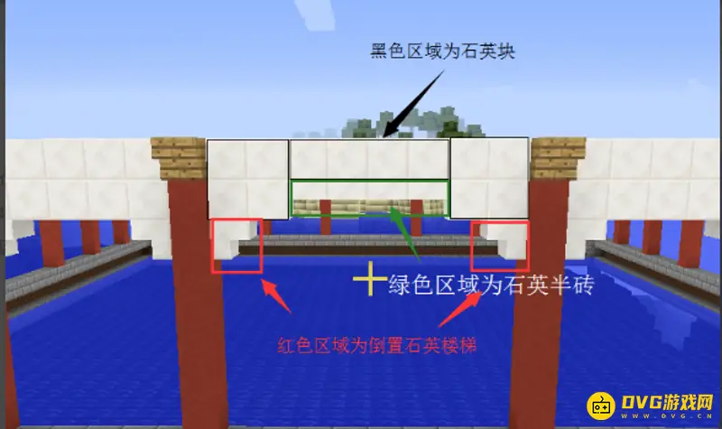 5、下面处理4个面的中间区域,如图所示:黑色区域放置的是石英块,绿色区域放置的是石英半砖,红色区域倒置石英楼梯。