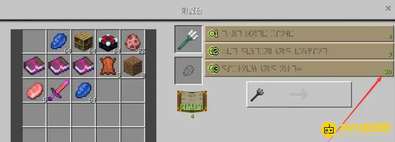 4、把书架在堆放一层,变为两层,然后点击附魔台进入附魔界面。附魔的等级提高了,由原来的18变为30。