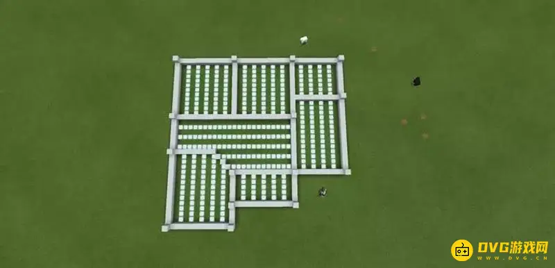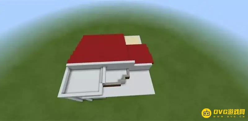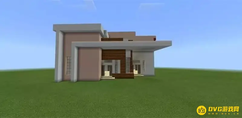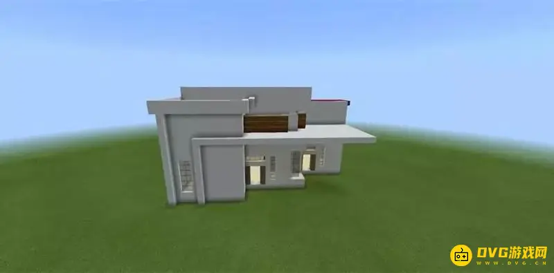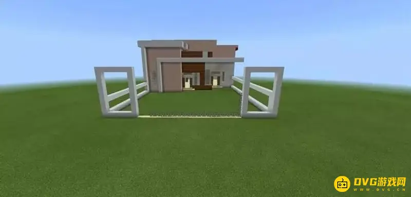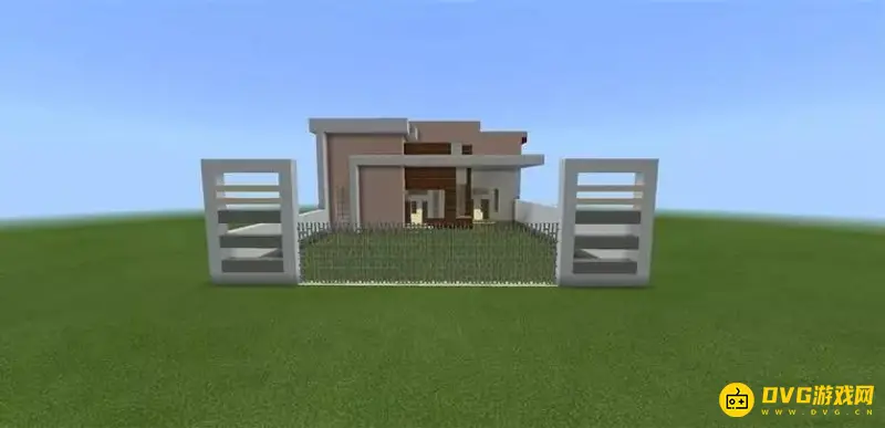 13、使用闪长岩间隔1填充,竖墙顶端使用石英台阶填充,正侧大门使用铁栅栏连接高度4,完成以后别墅整体完工。