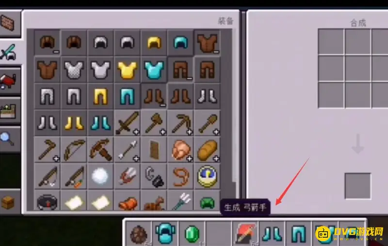 1.首先进入我的世界游戏之后,然后进行合成护身四件套,生成弓箭手,可以更有效的对敌人进行攻击,所以还是很有必要的,如图所示。